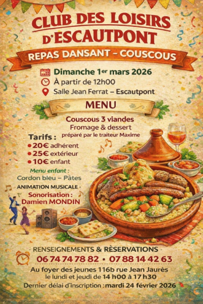Le Couscous du Club de Loisirs le Dimanche 01 mars 2026 à 12h 00 affiche repas club des loisirs a jour 2
