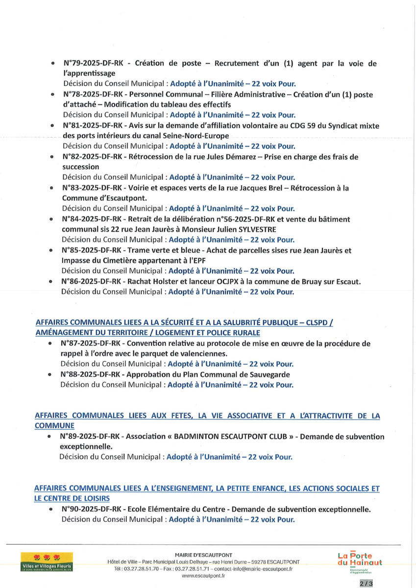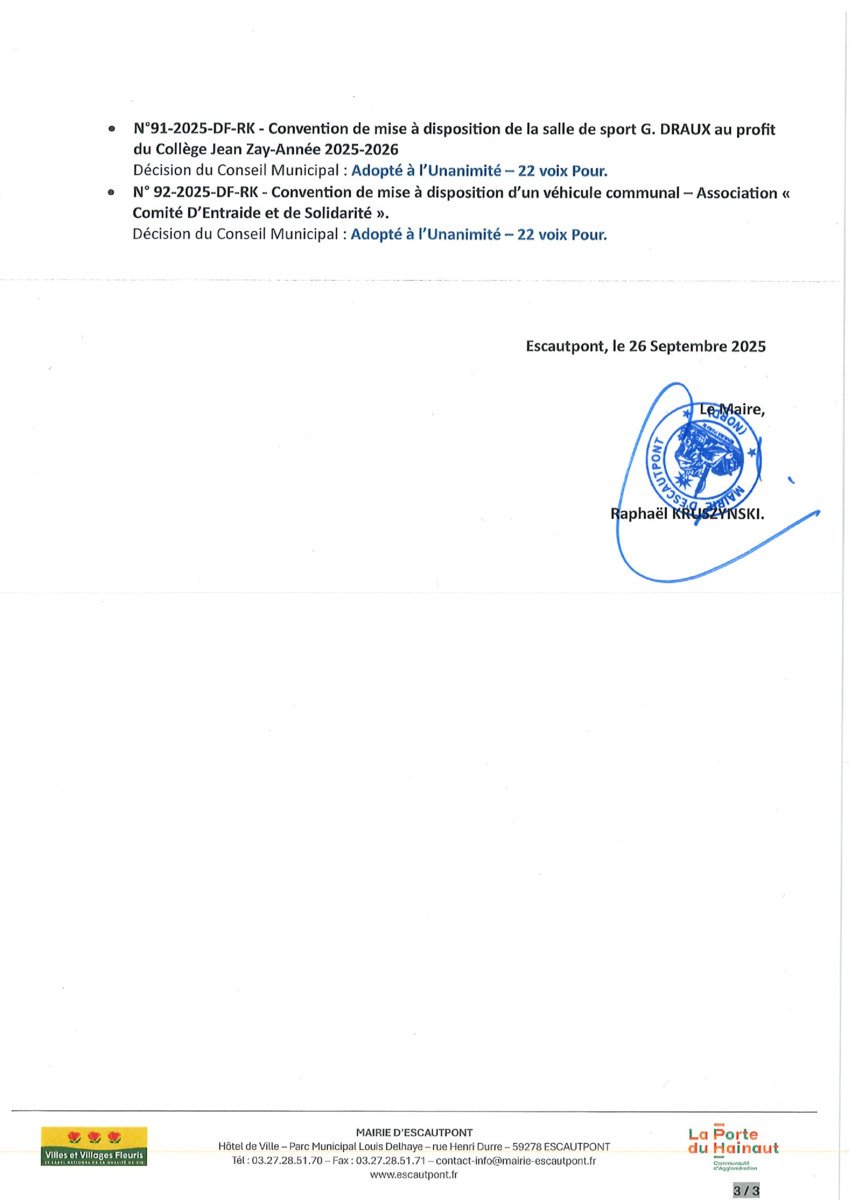 Liste des délibérations du Conseil Municipal du 25 septembre 2025