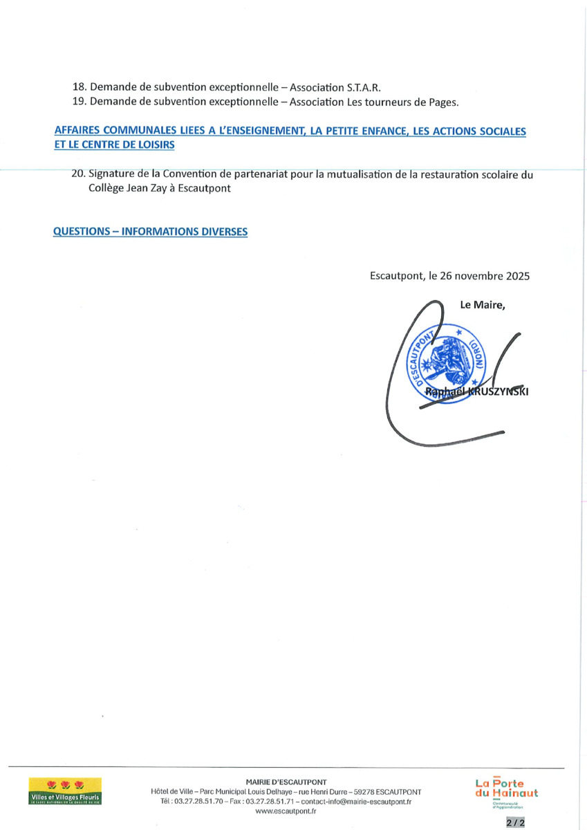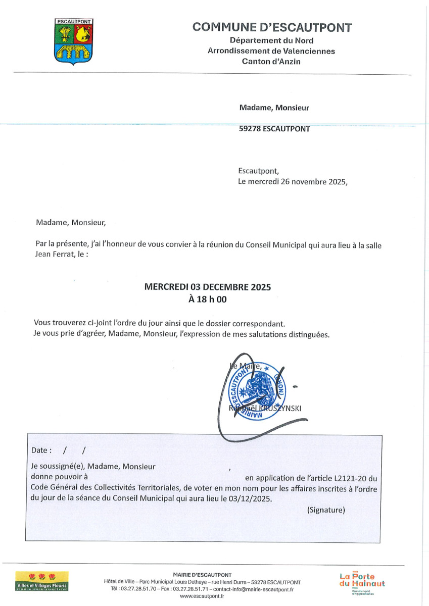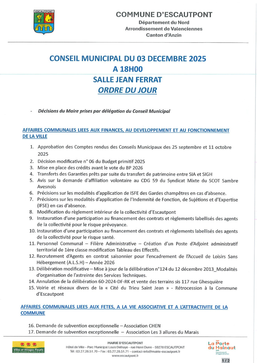 Ordre du jour de la séance du Conseil Municipal du samedi 3 décembre 2025