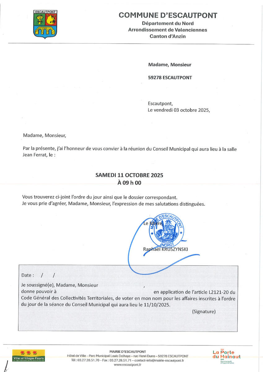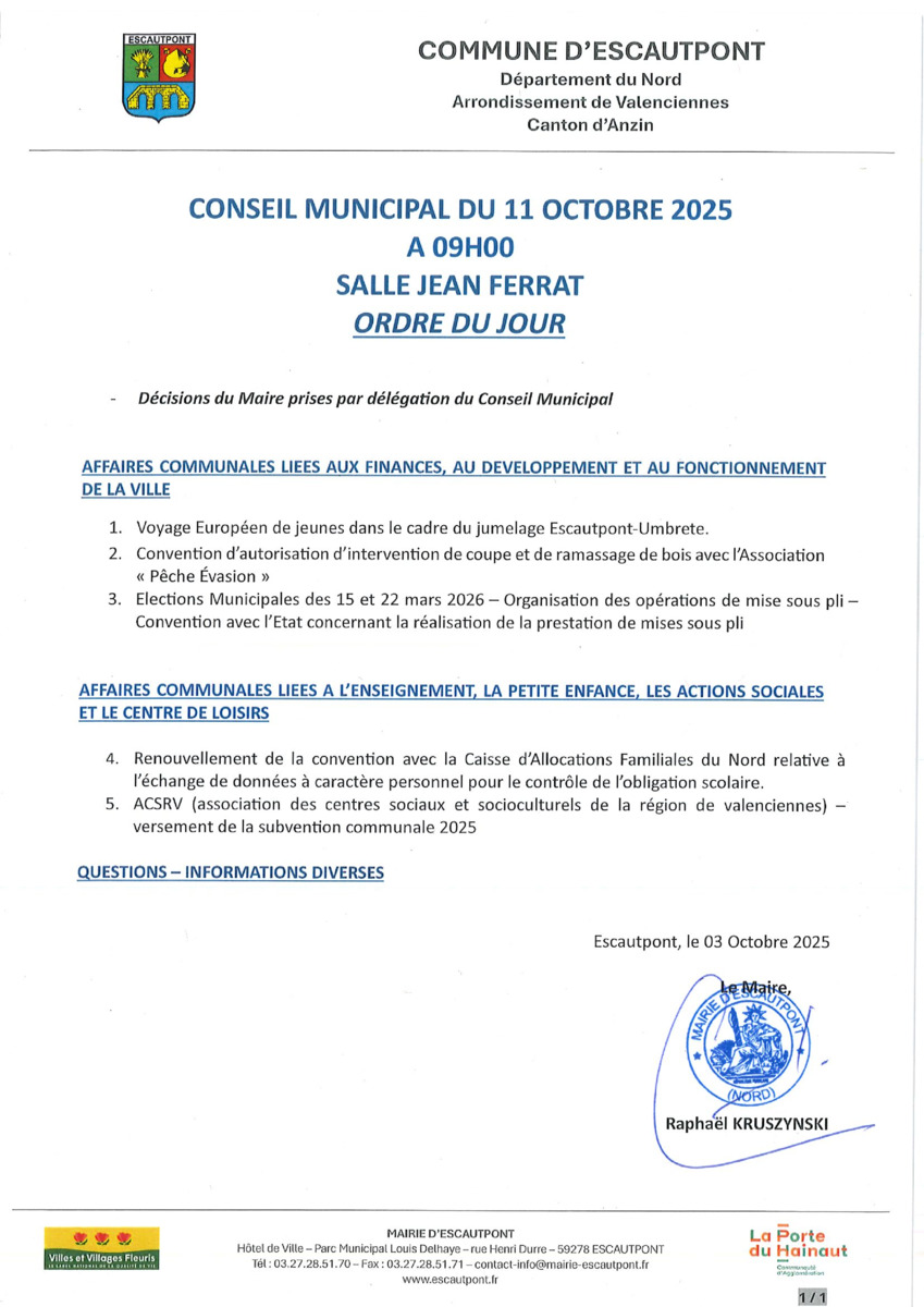 Ordre du jour de la séance du Conseil Municipal du samedi 11 octobre 2025