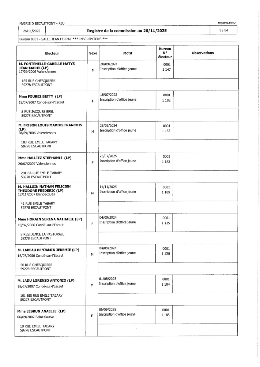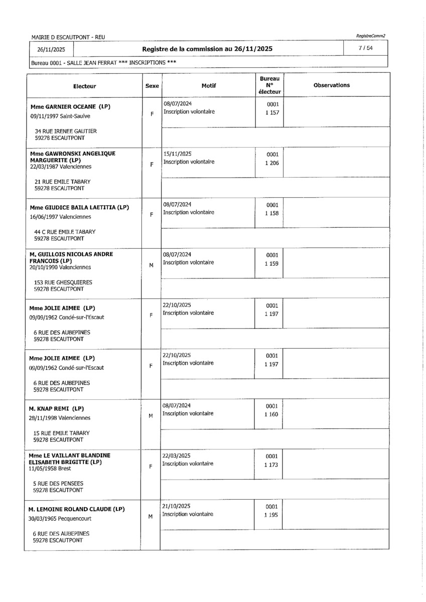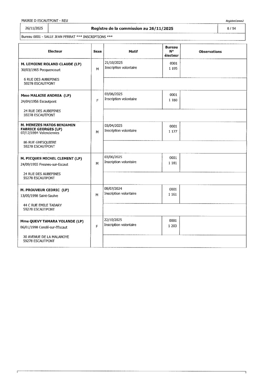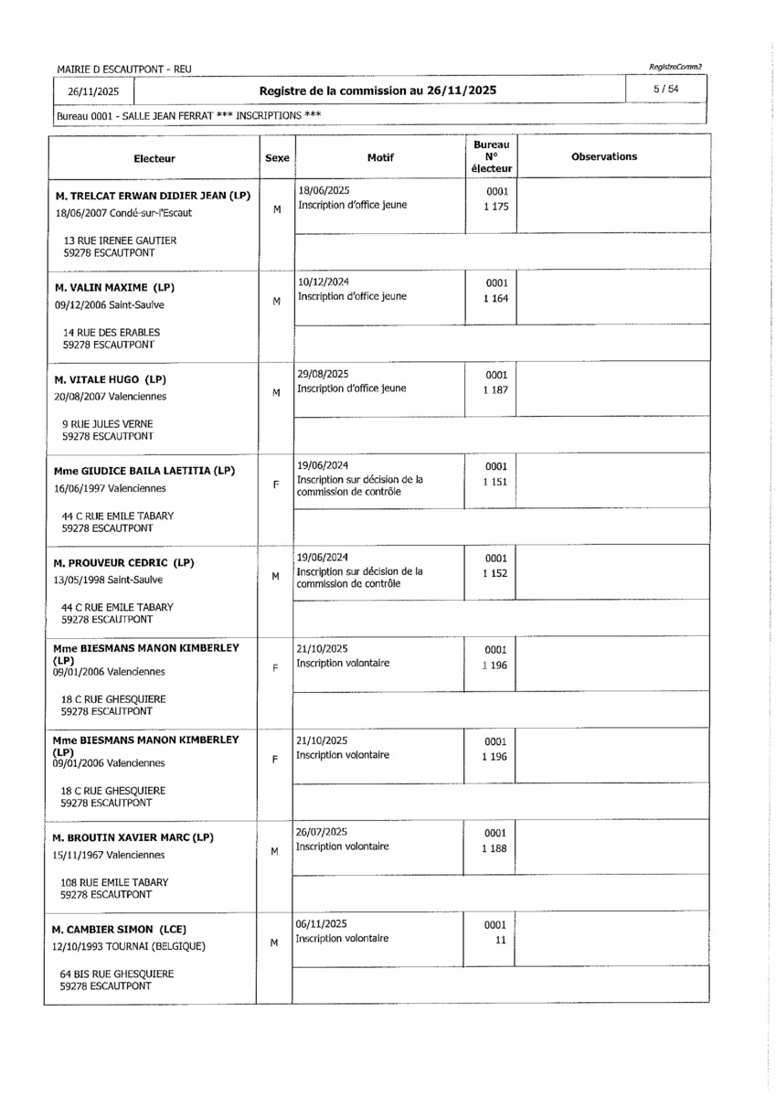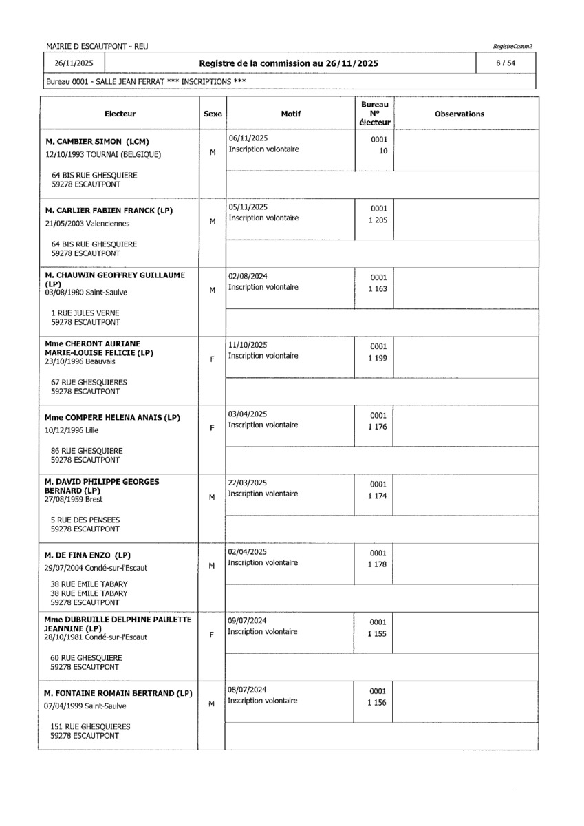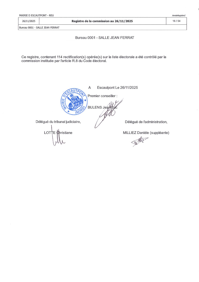 Registre de la Commission de contrôle des listes électorales du 26 novembre 2025