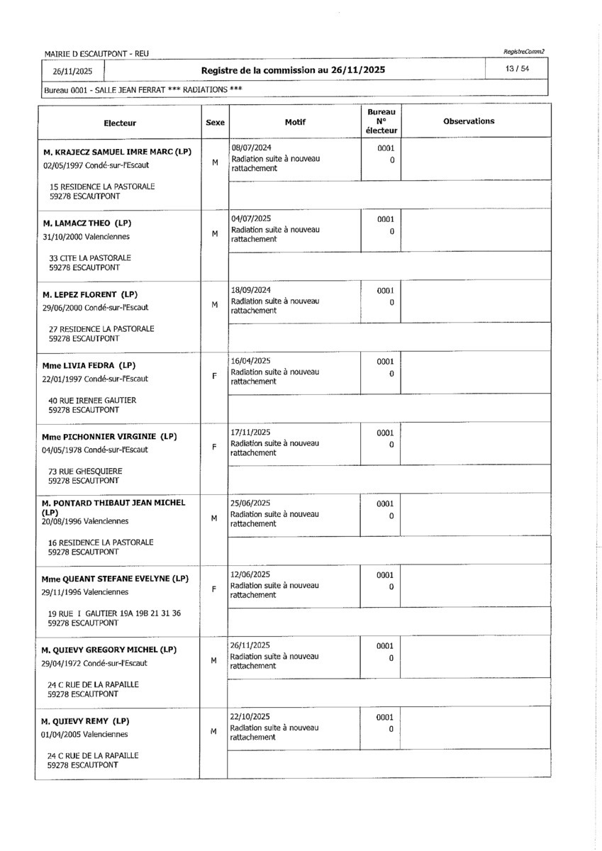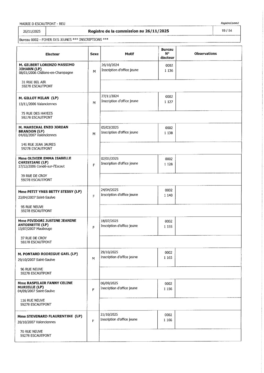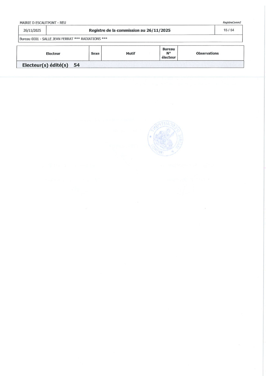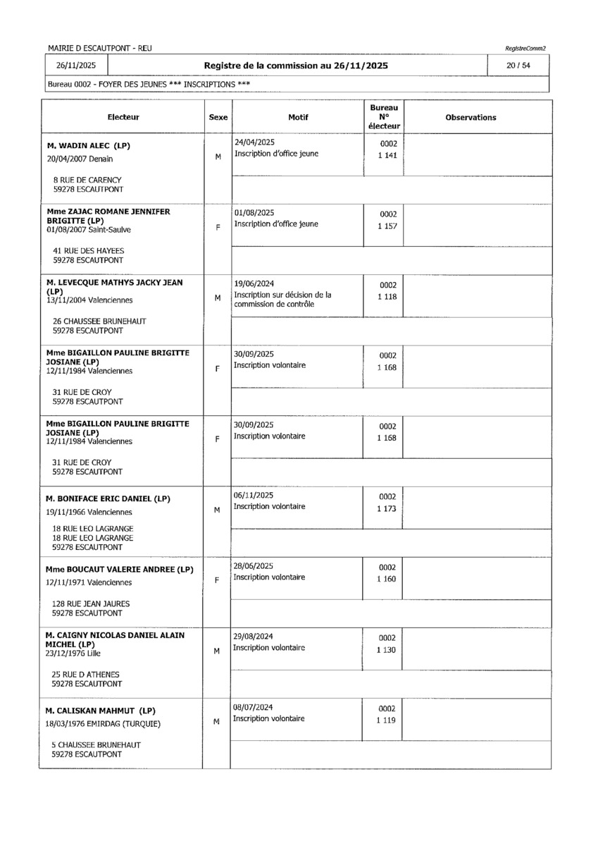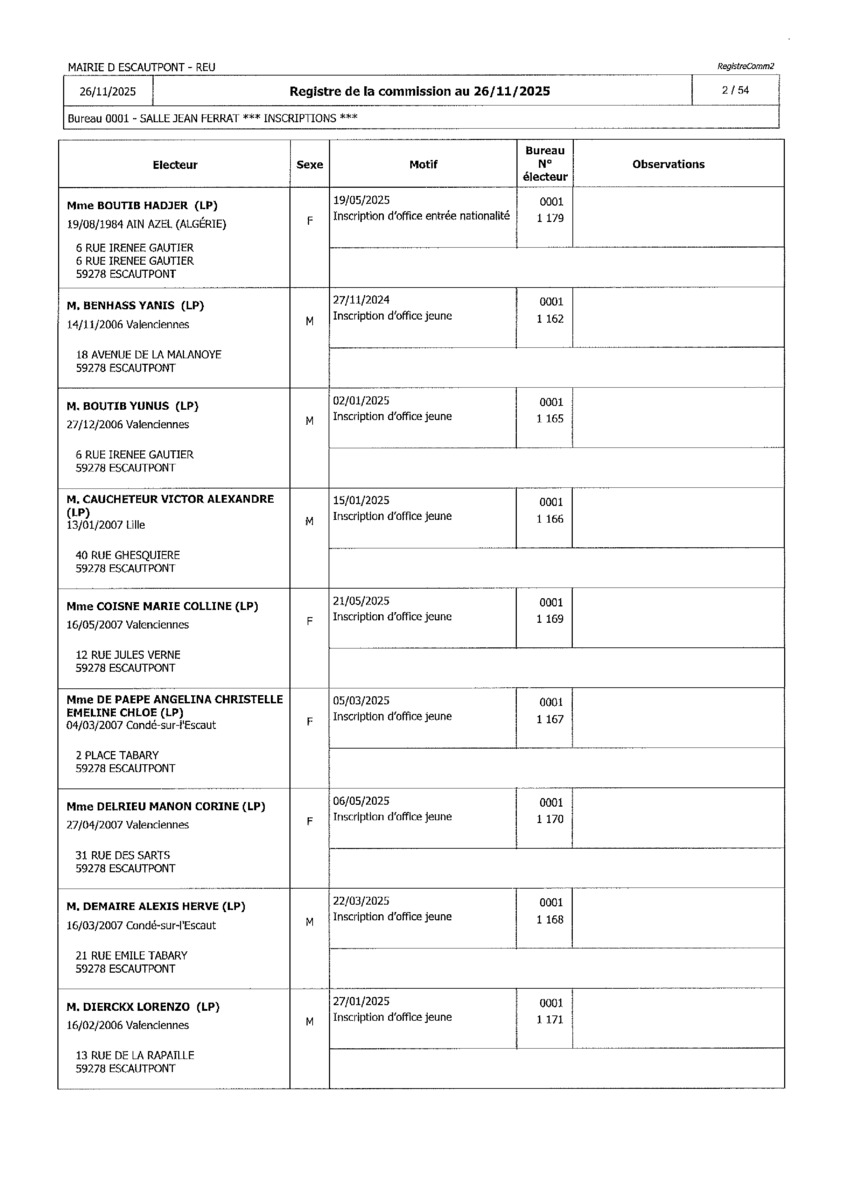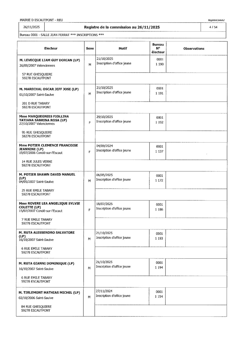 Registre de la Commission de contrôle des listes électorales du 26 novembre 2025