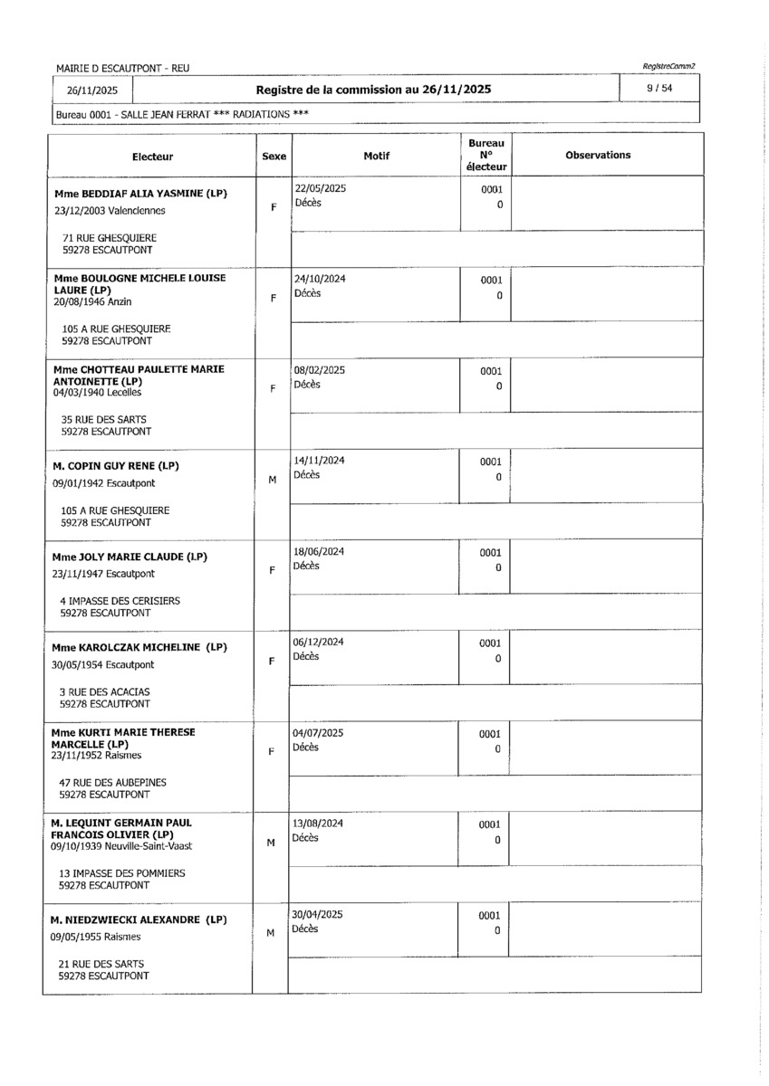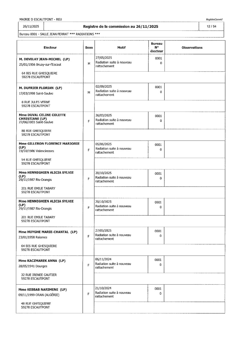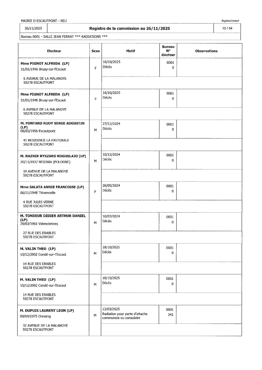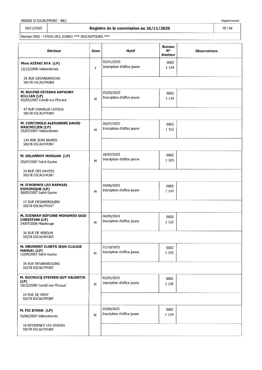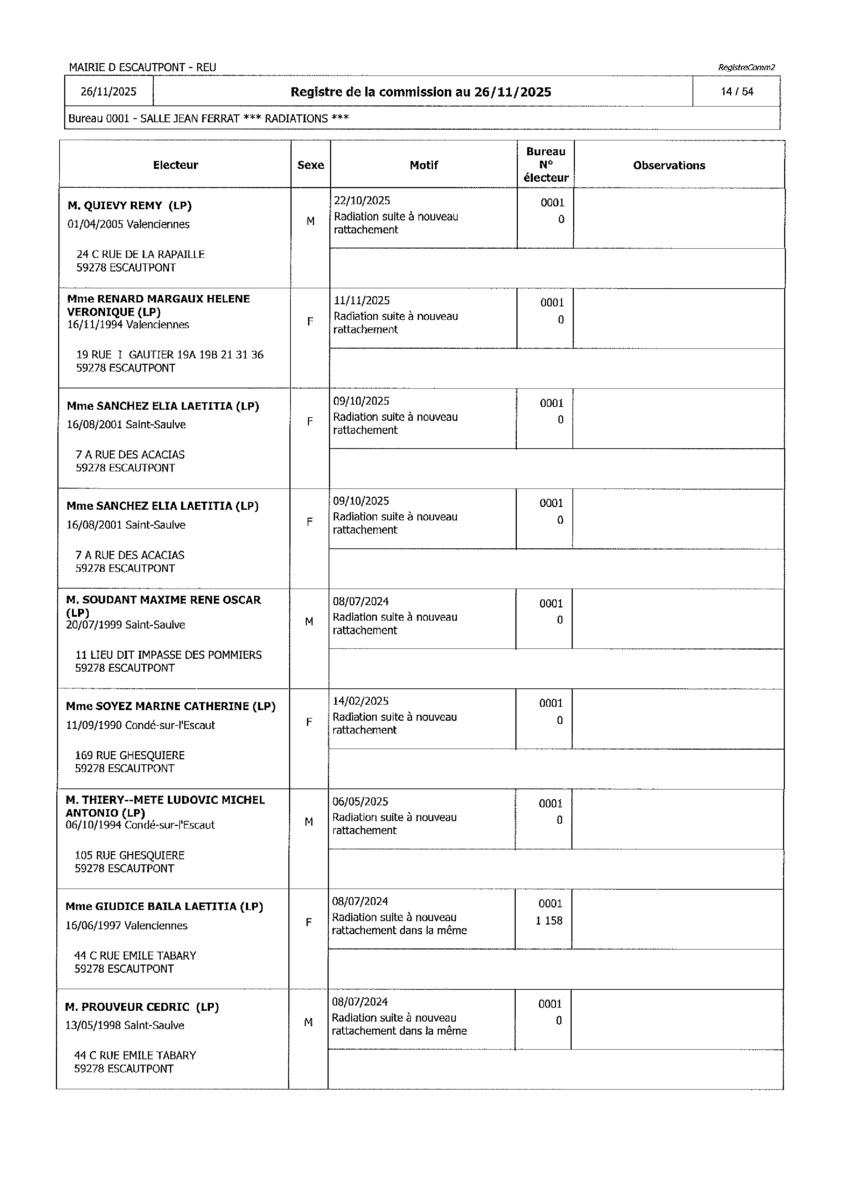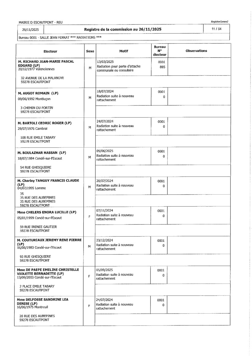 Registre de la Commission de contrôle des listes électorales du 26 novembre 2025